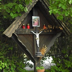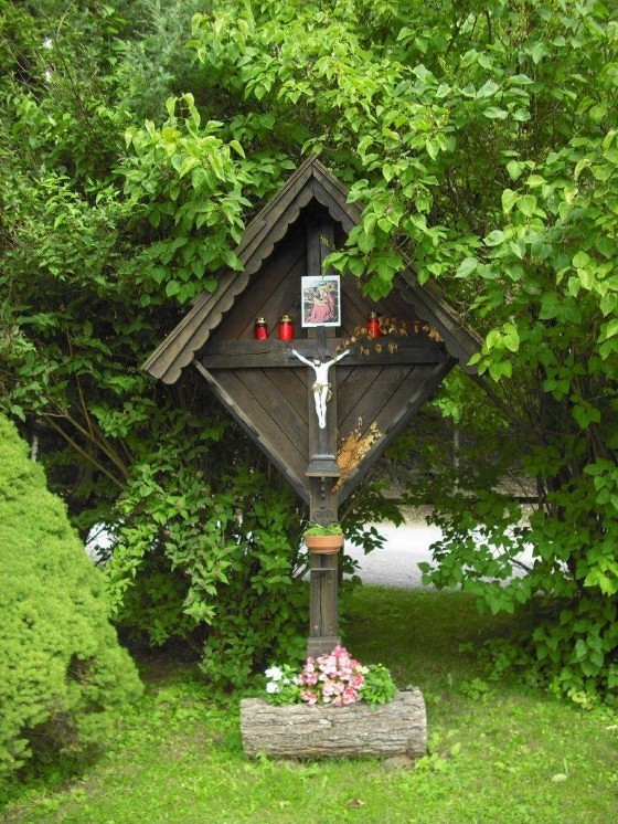 Dieses wunderbare Holzkreuz mit der Christusfigur steht zwischen dem Wohnhaus von Johann Fuchsbichler vlg. Hansbauer und Stall im Hofbereich, umgeben von schönen Flieder-, Jasmin- und Wacholdersträuchen.