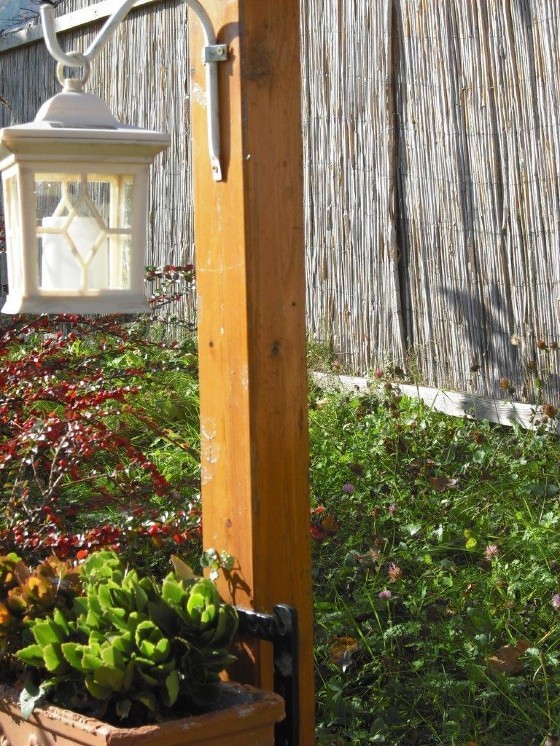 Unter dem Kruzifix sind eine weiße Laterne und ein Blumenkisterl angebracht. Ein Betonfundament sorgt für einen sicheren Standort. Sohn Patrik Neuherz, ein gelernter Spengler, stattete dieses Wegkreuz kunstvoll mit einem Kupferdach aus. Zwischen den gepflanzten Sträuchern ist auch ein Zugang möglich.