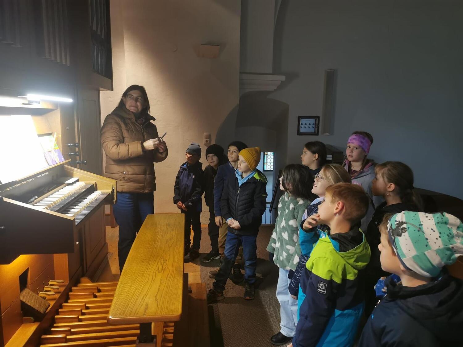 Die Volksschulkinder entdecken die Orgel in der Kirche
