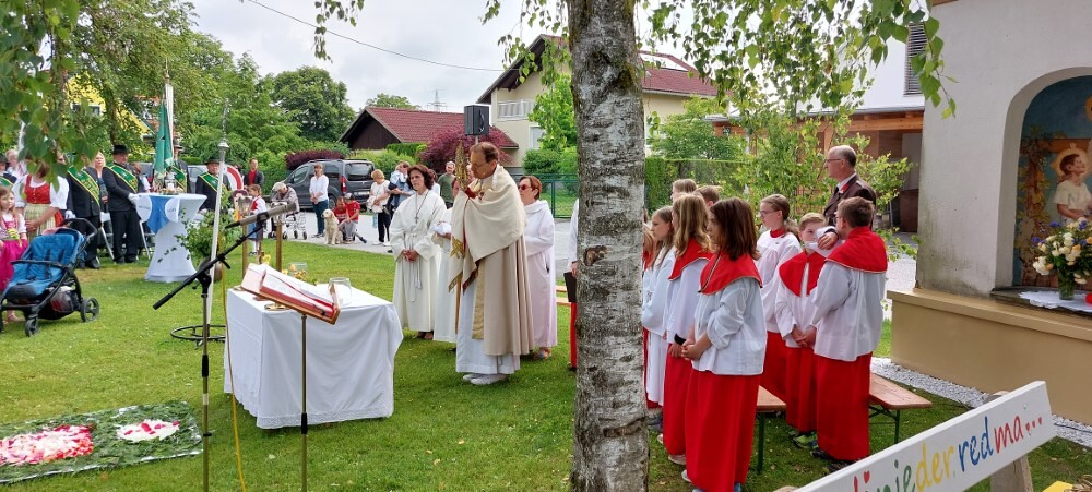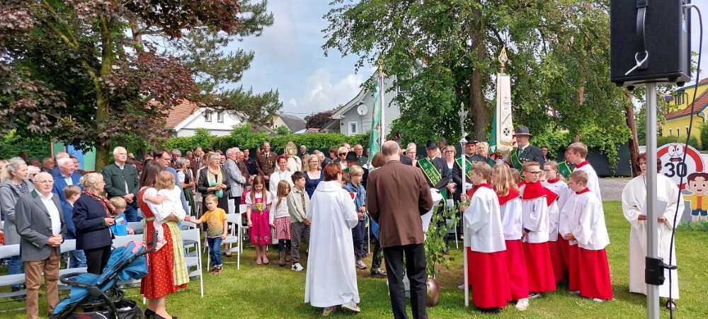 Im Anschluss an die Hl. Messe, zelebriert von Vikar Gerhard Hatzmann und begleitet von Kantorin, Lektoren und liturgischen Diensten beider Pfarren, fand eine Andacht bei den vier Stationen am Dorfplatz statt. Für die kleine Prozession waren vier Brottische als Altäre gerichtet, als Sinnbild für die vier Himmelsrichtungen und dafür, dass Christus der Heiland der ganzen Welt ist. Im gemeinsamen Liedruf "Brot des Lebens" zogen die liturgischen Dienste und die Kinder stellvertretend für das Volk Gottes zu den vier Altären: Brot der Liebe – Brot der Versöhnung – Brot des Friedens – Brot der Hoffnung. Zum Abschluss erteilte Vikar Hatzmann den Eucharistischen Segen, verbunden mit der Einladung, das Allerheiligste gemeinsam zur Kirche zu begleiten. Die Feier schloss mit dem gemeinsam gesungenen "Te Deum" ab. Zu den Feierlichkeiten waren auch die Vereine wie Feuerwehr und ÖKB eingeladen.