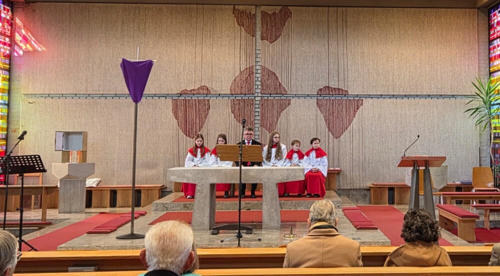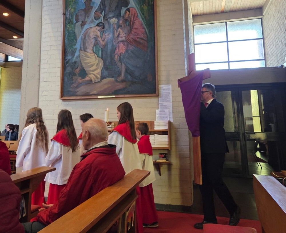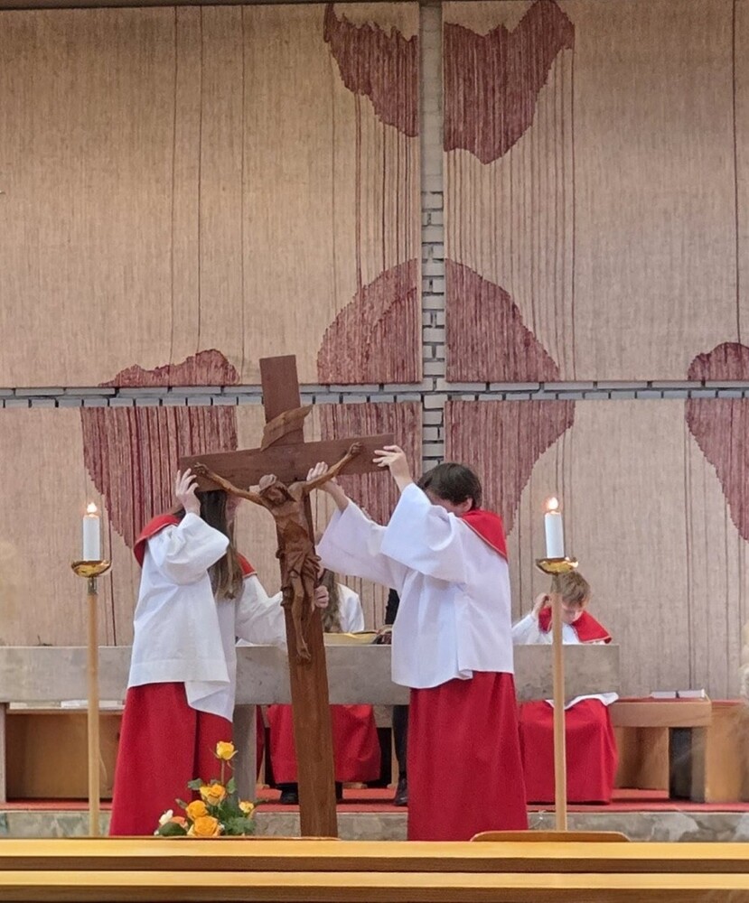 Der Karfreitag wurde in Stille vor dem leergeräumten Altar mit den Zeichenhandlungen der Kreuzverehrung, den großen Fürbitten und der Grablegung begangen. Gestaltet wurde die liturgische Feier von Thomas Possert und einem Ensemble rund um Siegfried Kager.