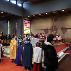 Tina Fegerl hat mit den Kindern in vielen Proben wieder ein tolles Krippenspiel einstudiert und eine besinnliche Andacht vorbereitet. Musikalisch begleitet wurde es von einer Bläsergruppe von klein bis groß.